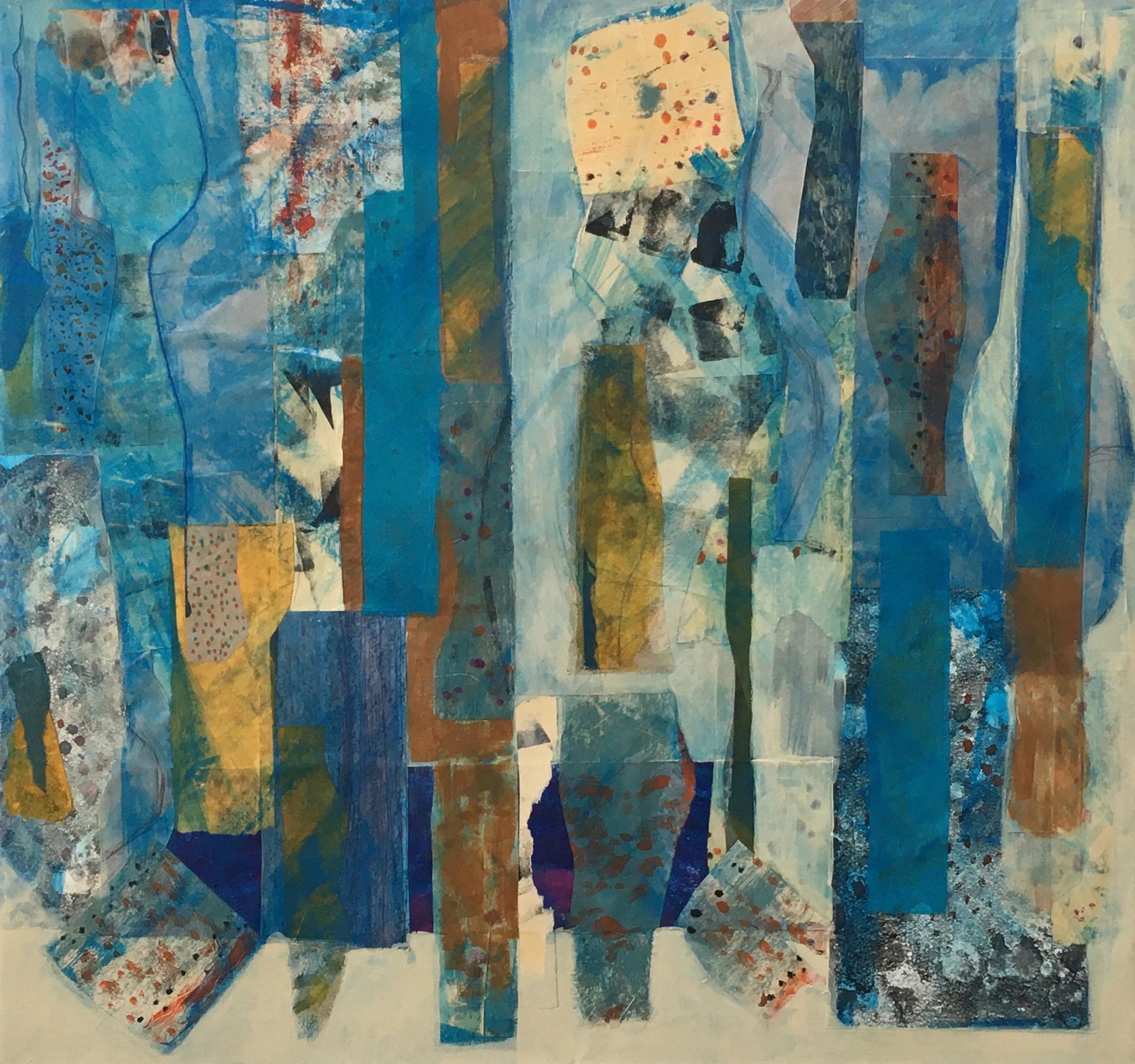 Traces of habitation and patterns of urban landscape appear in delicate, complex paintings. Jane builds up her images in layers of drawing, paint, ink and cut out paper. Papers used may be found or made for purpose hand-stained, printed and torn.